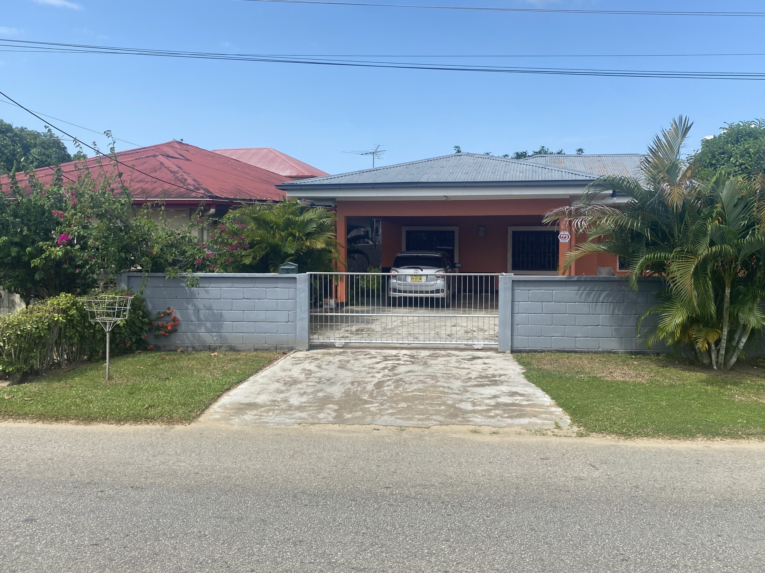 Mooie, goed onderhouden tuin met o.a. zilverplant, rode palmen, mangoboom en papayaboom