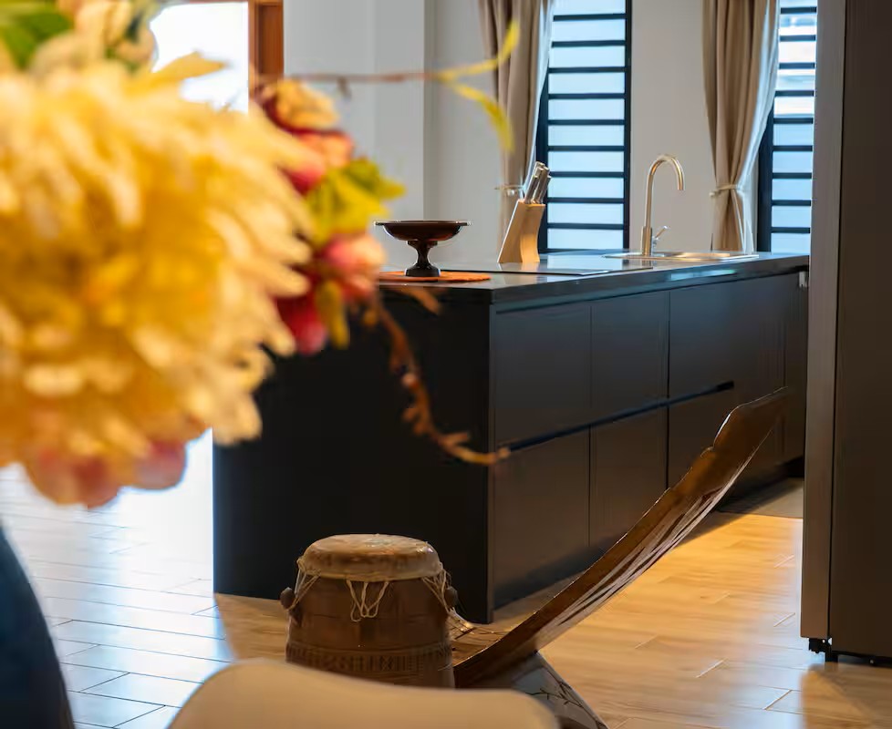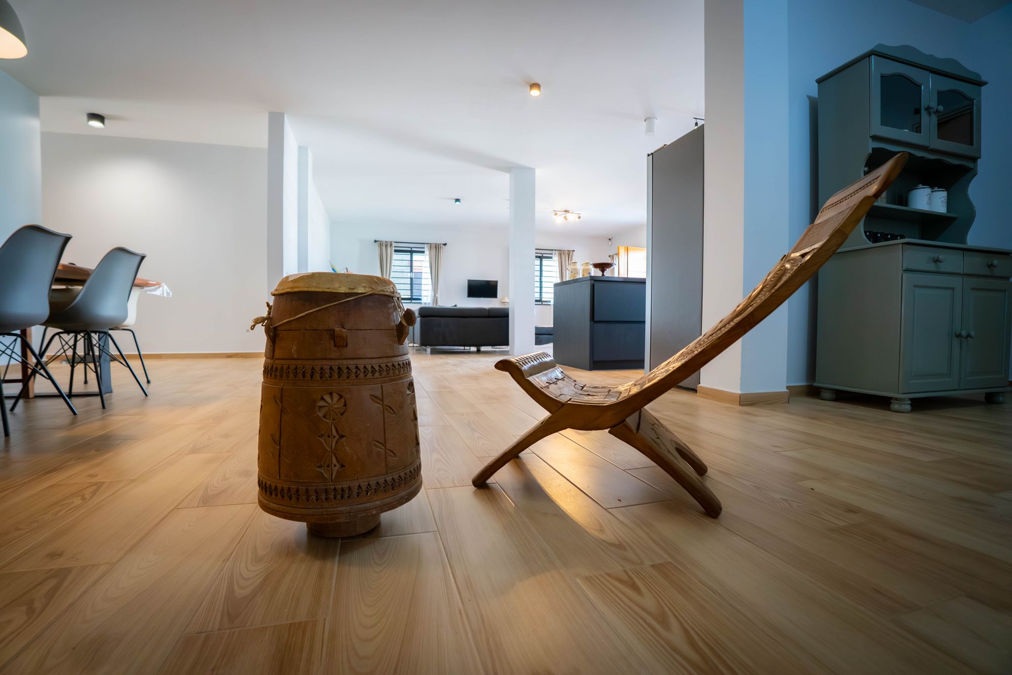 De woonkamer is voorzien van een royale leren hoekbank, een stijlvolle zithoek en een moderne open keuken met groot kookeiland — dé plek om samen te genieten. De eethoek met houten tafel en designstoelen vormt het hart van het huis, perfect voor lange avonden met familie of vrienden.