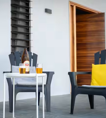 Buiten is er een gezellige zithoek waar je in alle rust kunt genieten van de tropische zonsondergang, vergezeld door een verfrissend drankje.